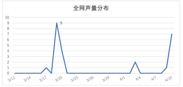统计时间段内,此事件全网声量有24条,前期均没有声量传播,其中只有3月17日。3月19日、3月20日、4月3日、4月9日、4月10日有相关信息在传播,其中4月19日达到传播最高峰,当日峰值为9条。