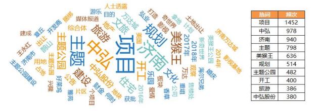 根据热词云图,“项目” 以1452次的提及频次排在热词榜第一位,其次核心词汇“中弘”、“济南”、“主题”、“美猴王”等词也以较高频次出现在热词榜中。