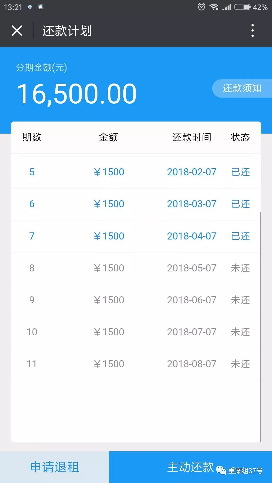 ▲元宝e家平台上一名租户的还款计划。 APP截图
