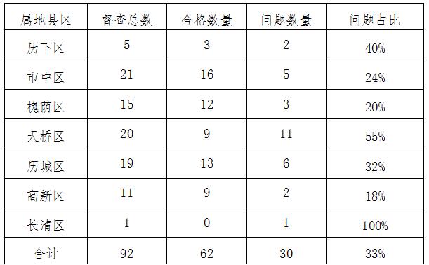 按属地辖区划分,本周督查工作检查分布在历下区、市中区、槐荫区、天桥区、历城区、高新区、长清区共计7个县区。