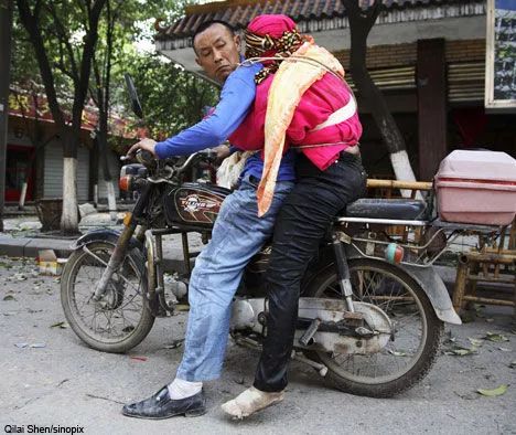 5.12地震中,吴加芳骑摩托背亡妻回家的照片。图片来自网络