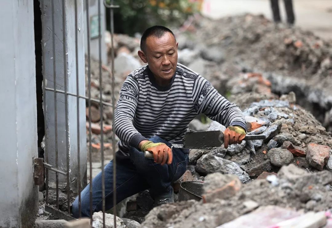 他现在是绵竹市一家工地上的泥瓦工,为老小区整修天然气管道。每天早晨六点起床,从早八点干到下午六点,中午有一个小时吃饭时间,忙到精疲力竭,挣150块钱。