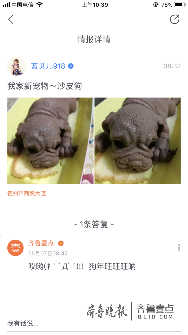 情报员“蓝贝儿918”8点32分发布消息:我家新宠物~沙皮狗。
