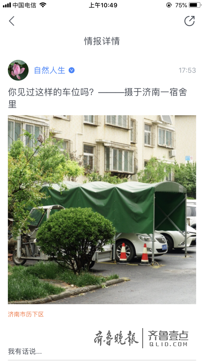 情报员“自然人生”17点53分发布消息:你见过这样的车位吗?——摄于济南一宿舍里。