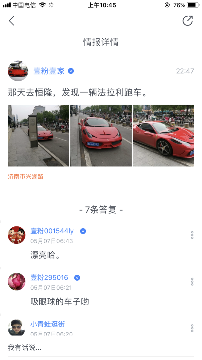情报员“壹粉壹家”22点47分发布消息:那天去恒隆,发现一辆法拉利跑车。
