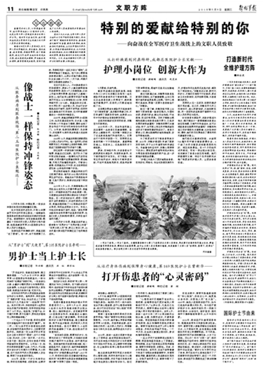 党的十九大以来,全军文职人员护士始终以习近平强军思想为指引,牢记南丁格尔“竭诚协助医师诊治,务谋病者之福利”的宣誓,秉承无私奉献、救死扶伤的光荣传统,立足本职岗位尽职尽责,从常规护理到科研攻关、从为兵服务到战场救治,处处闪耀着她们忙碌奉献的身影,彰显出新时代白衣战士的靓丽风采。今日,《解放军报》“文职方阵”版采撷部分文职人员护士的强军故事,以飨读者。