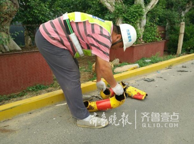 5月18日下午5时左右,齐鲁晚报•齐鲁壹点记者在济南历城一中门前的环湖路上看到,穿着交通反光马夹的施工人员,正在清理今天凌晨被撞坏的隔离桩。