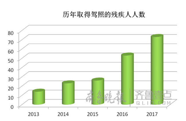据济南市车管所考试科统计数据显示,2013年到2017年取得驾照的残疾人分别为14人、23人、26人、53人、73人,而2018年至今已有32名残疾人取得了驾照。由此可见,残疾人的报考率有逐年增加的趋势。