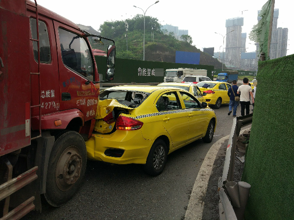 此时海尔路上车辆稀少,李某便把车越开越快。没想到行驶到海尔路寸滩立交段时,因轻轨施工道路变窄,前方出现了交通拥堵。李某手忙脚乱的急踩刹车,但为时已晚,引发了追尾事故。三辆刚出厂不久的出租车均不同程度受损,尤其是被撞的第一辆出租车,尾箱严重溃缩,勾住了货车头部无法分离,车内三人不同程度受伤。