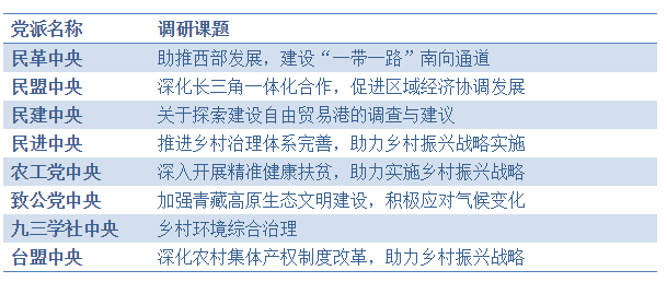 今年“两会”后,各党派中央陆续公布并开展今年的“大调研”,具体调研主题见下表。