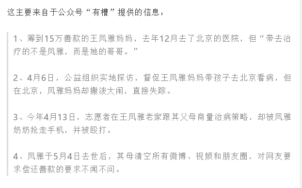 遗憾连着愤怒,成了很多网民在此事上的反应。不少人顺着网帖爆料,将矛头指向小凤雅家人。这其中,上述爆款文章提供的信息,如其家人筹到15万善款却“救儿弃女”,还拒绝偿还善款等,就起到了推波助澜的作用。一时间,指斥小凤雅家人“利用女儿的重病行骗”的声音甚嚣尘上。