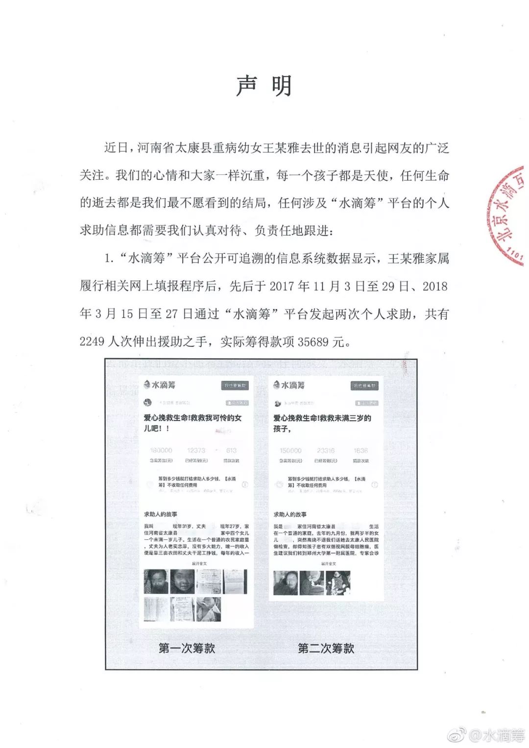 ▲水滴筹方面的声明。据调查,小凤雅家人从其他两个平台募捐得的资金约3万。
