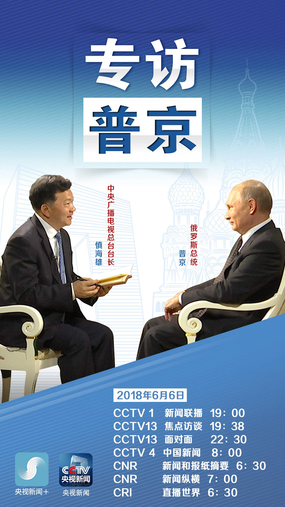 原标题:敬请关注:俄罗斯总统普京接受中国中央广播电视总台台长慎海雄专访