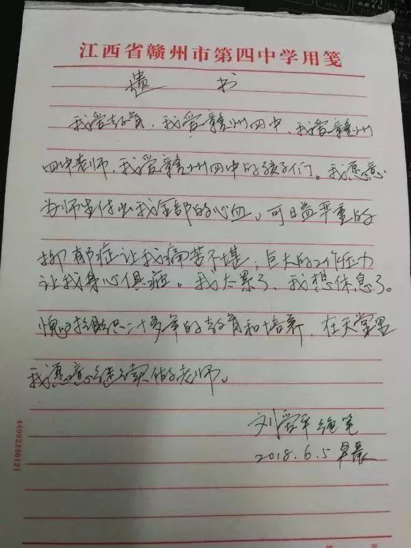 “遗书”写道:我爱教育,我爱赣州四中,我爱赣州四中的老师,我爱赣州四中的孩子们,我愿意为全体师生付出全部心血,可日益加重的抑郁症让我痛苦不堪,巨大的工作压力让我身心俱疲,我太累了,我想休息了…...在天堂里我愿意继续做老师。