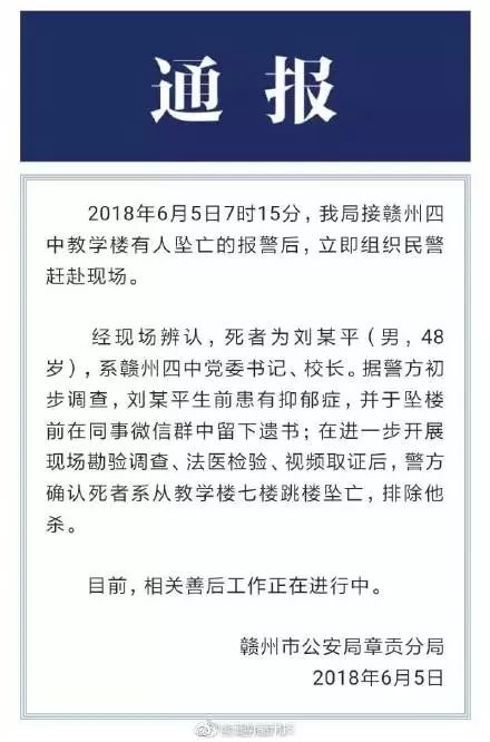 经现场辨认,死者为刘某平(男,48岁),系赣州四中党委书记、校长。据警方初步调查,刘某平生前患有抑郁症,并于坠楼前在同事微信群中留下遗书;在进一步开展现场勘验调查、法医检验、视频取证后,警方确认死者系从教学楼七楼跳楼坠亡,排除他杀。
