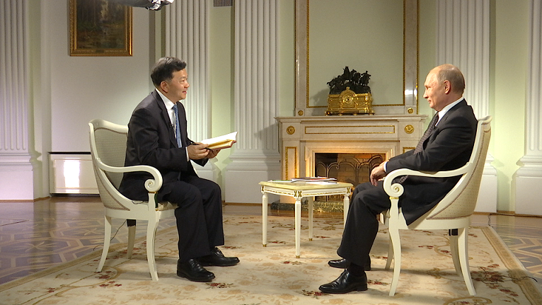 当地时间5月31日晚,在出席上海合作组织成员国元首理事会青岛峰会并对中国进行国事访问前夕,俄罗斯联邦总统普京在莫斯科克里姆林宫接受了中国中央广播电视总台台长慎海雄的独家专访。普京讲述了他对习主席的印象,回答了他在《国情咨文》中提出的“俄罗斯梦想”与“中国梦”的异曲同工之处,展望了中俄关系以及上合组织扩员后的前景,并就“一带一路”建设、朝鲜半岛问题等国际热点、俄罗斯与西方国家关系等作了回答。这是普京就任新一届总统后首次接受国外媒体专访,也是普京总统首次在克里姆林宫接受中国媒体的专访。