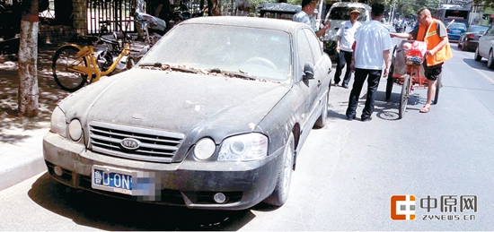 昨日8时40分,建中街办事处巡防中队淮南分队队员王李根、马根喜巡逻至淮河路与淮南街交叉口时,发现向南约20米路西仍停放着一辆山东号牌的起亚轿车和一辆郑州号牌的长安面包车,两车均被大量尘土覆盖,看起来已经在路边停放较长时间。