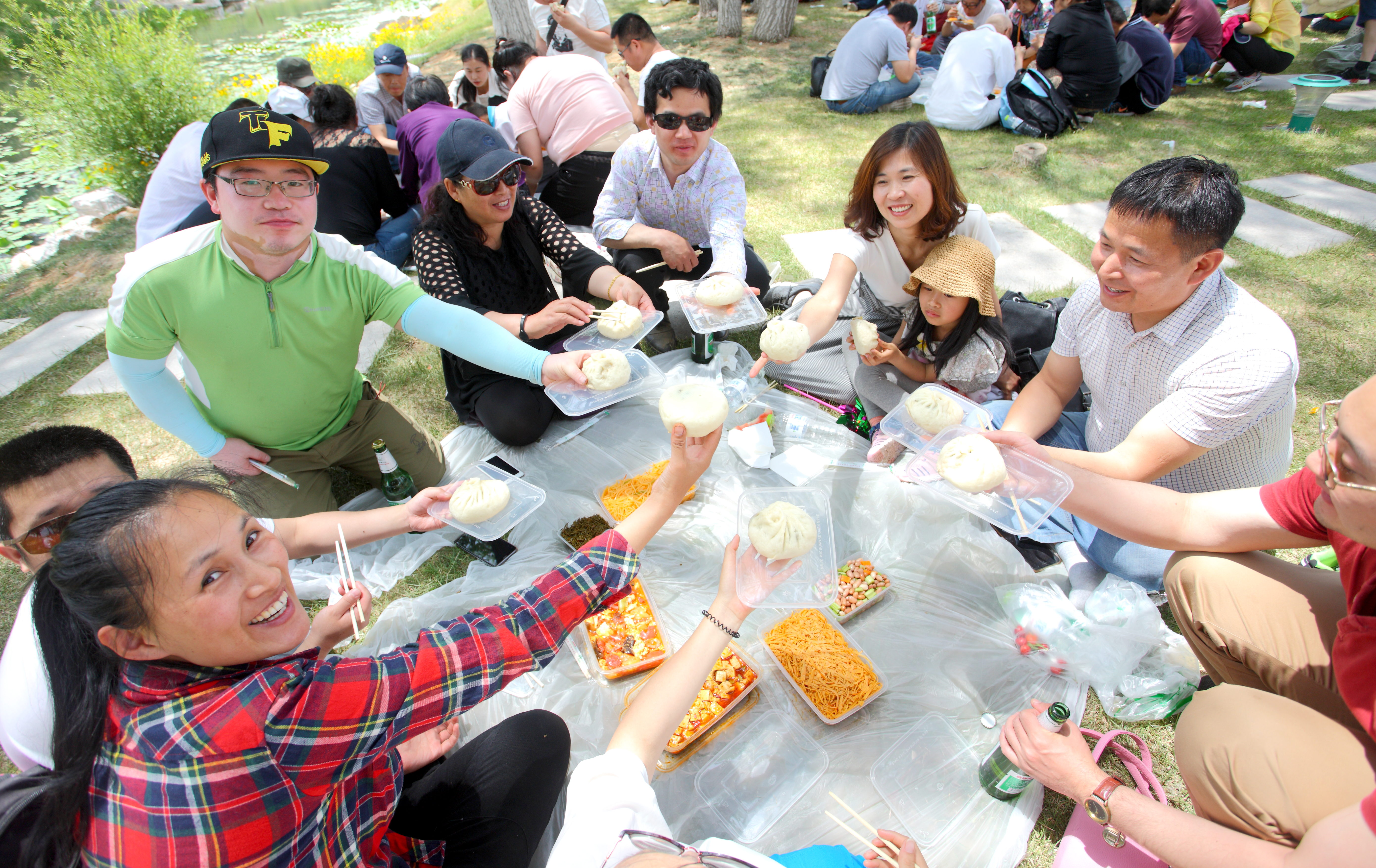午餐时间到了,双举海参提前准备了热腾腾的饭菜以及凉爽的饮料,大家席地而坐,快乐无比!更难能可贵的是,80名盲人朋友第一次品尝到了双举海参员工提前为他们准备的海参槐树花包子,让他们感动不已。