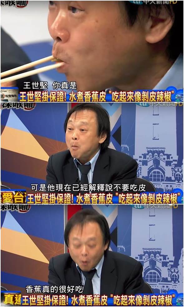赖清德日前推荐民众生香蕉带皮水煮,之后搭配酱油、大蒜蘸吃,还称这种吃法“养生又美味”。但王世坚却误解是连皮一起吃下肚,并公开在某政论节目中吃了起来,一边吃一边大赞香蕉皮像“剥皮辣椒”、“还蛮好吃的”。