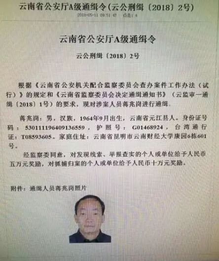其实,说起通缉令,小伙伴们应该还记得不久前被抓的西南林业大学原校长蒋兆岗。此人收到的就是云南省公安厅在今年5月10日发出的A级通缉令。