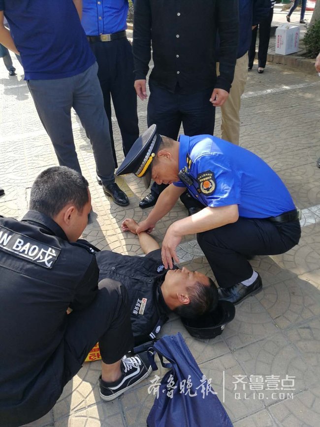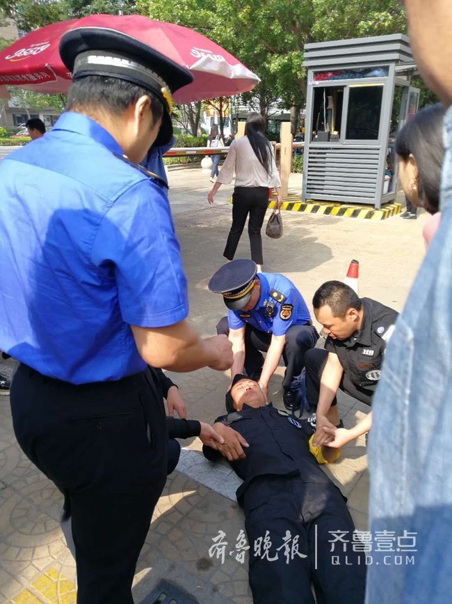 6月12日上午8点,青岛市南区香港中路影视大酒店门前,一名正在执勤的安保人员突然重重地摔倒在地,不省人事,现场正在巡逻的青岛市城管执法支队规划执法大队执法人员见状立即用所学急救知识施救,随后这名安保人员被送往医院救治救回一命。