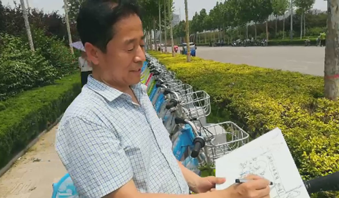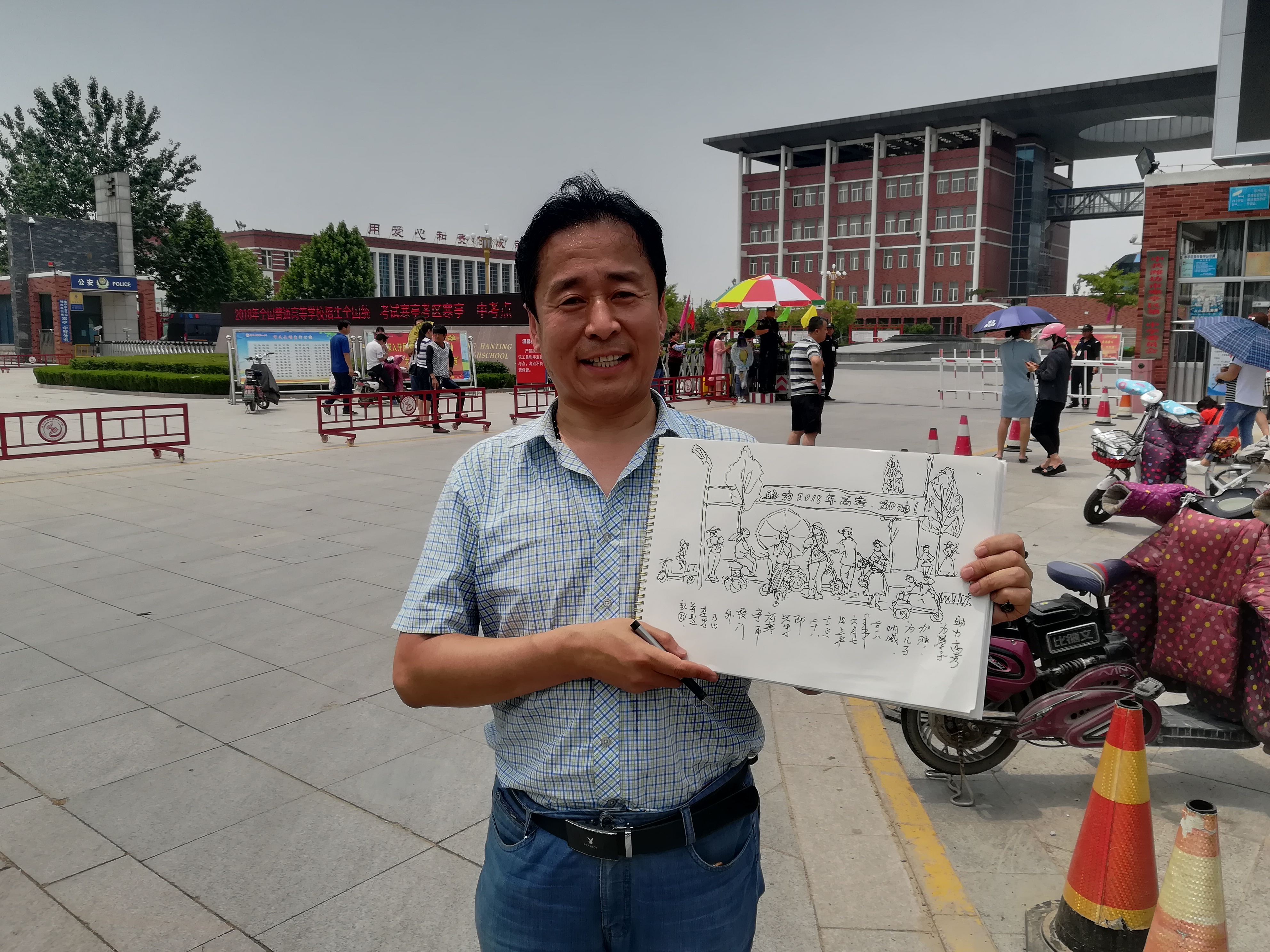 王乃田是潍坊某高校的美术设计老师,只见他拿着一支中性笔,在画纸上不停勾勒,短短十几分钟的时间,他速写了考场外家长等待孩子的一个场景。他在画上还写上了“助力2018高考,加油”字样。在落款处写了“为学子加油为儿子助威”。