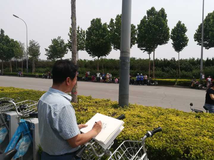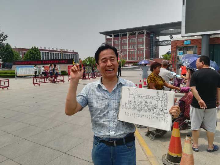 上午11点记者在寒亭一中考点看到一位家长在拿着画板在画着什么,采访得知,他正在画考场外的场面,记录下孩子高考当天的一些情景,给孩子加油,作为礼物送给孩子。