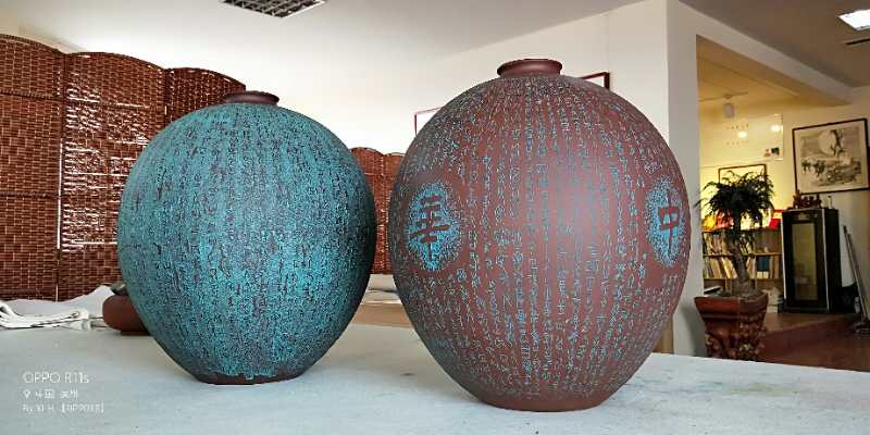近几年,他将甲骨文书法艺术与紫砂、陶瓷等艺术有机契合,创作的艺术作品更加古朴典雅,多次在省陶艺设计创新大赛中获奖,其近期主与山东小苍紫砂工作室合作设计创新的甲骨文字书法阴阳刻绘紫砂瓶系列作品《中华基因》,又荣获2018年山东省民间艺术博览会大奖。