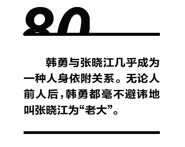 韩勇的所作所为也换来了张晓江的另眼相待,韩勇先后分管国土、建设等领域,被认为是张的得力干将。到了后期,韩勇与张晓江几乎成为一种人身依附关系。无论人前人后,韩勇都毫不避讳地叫张晓江为“老大”。
