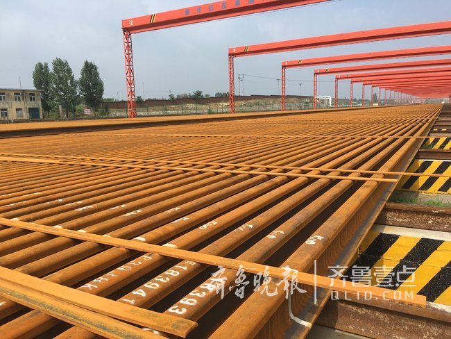 全部500米长钢轨都是从这里由32台跨度为25米的群吊组整体吊装,放置到36节平板车组成的长轨大列上,运送到铺轨现场。(齐鲁晚报·齐鲁壹点记者 王瑞超)