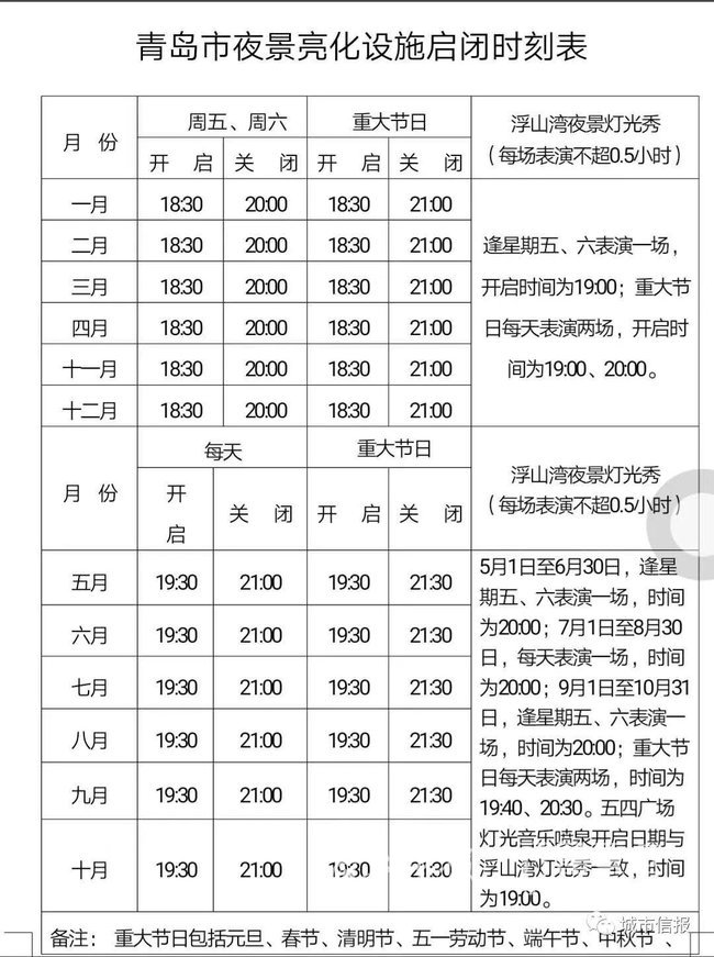六、五月的风雕塑、栈桥、小青岛、小鱼山、电视塔等地标性建筑每天运行,按规定亮灯时间启闭。