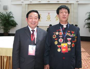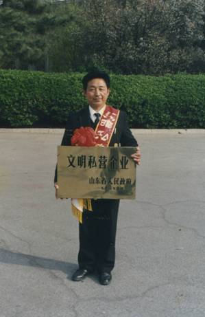 这张照片就是1993年在山东省经济工作会议上,荣获“山东省文明私营企业”称号,领取奖牌后拍摄的。