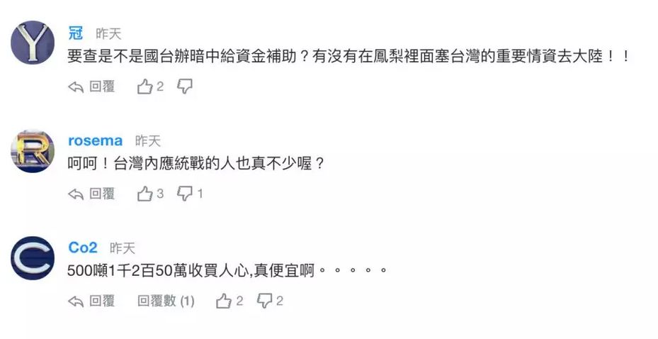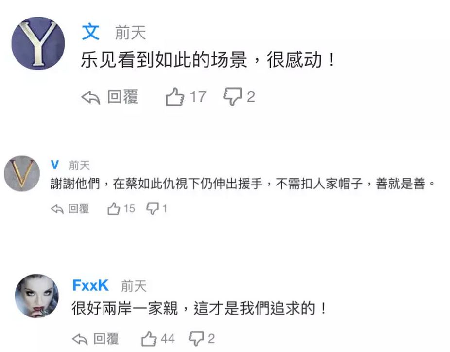 而在台湾某社交论坛,关于这则新闻的讨论居然是,大陆越是表现得如此诚意,台湾越不能走向统一,否则从大陆那里骗取的利益都会失去。