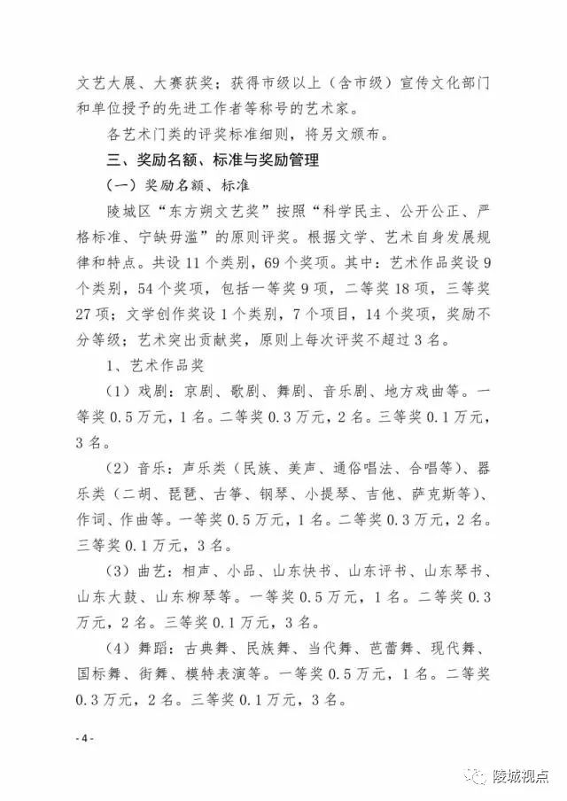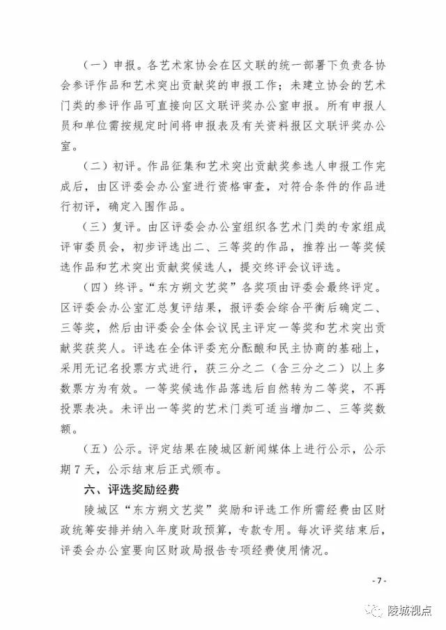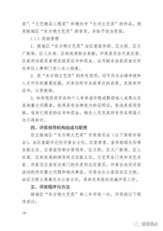 陵城区“东方朔文艺奖”按照“科学民主、公开公正、严格标准、宁缺毋滥”的原则评奖。根据文学、艺术自身发展规律和特点。每两年评选一次,共设文学、曲艺、音乐、书法等11个类别,69个奖项。