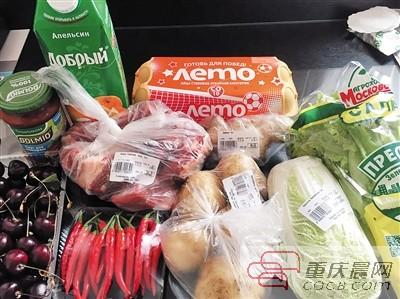 昨天,我在这家超市买了一大袋牛排骨、一大盒车厘子、一盒鸡蛋、一袋土豆、一瓶番茄酱、一小包辣椒、一袋生菜、一袋白菜、一瓶橙汁,最后结账为904卢布,还不到100块。