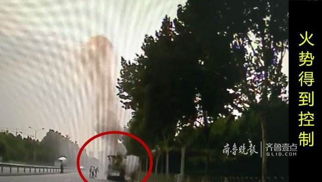 原标题:济南一辆水泥泵车窜出一米高火焰,他拎起灭火器就上