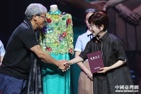 洪秀柱从中国丝绸博物馆馆长赵丰处接过收藏证书。(中国台湾网 李奕均 摄)