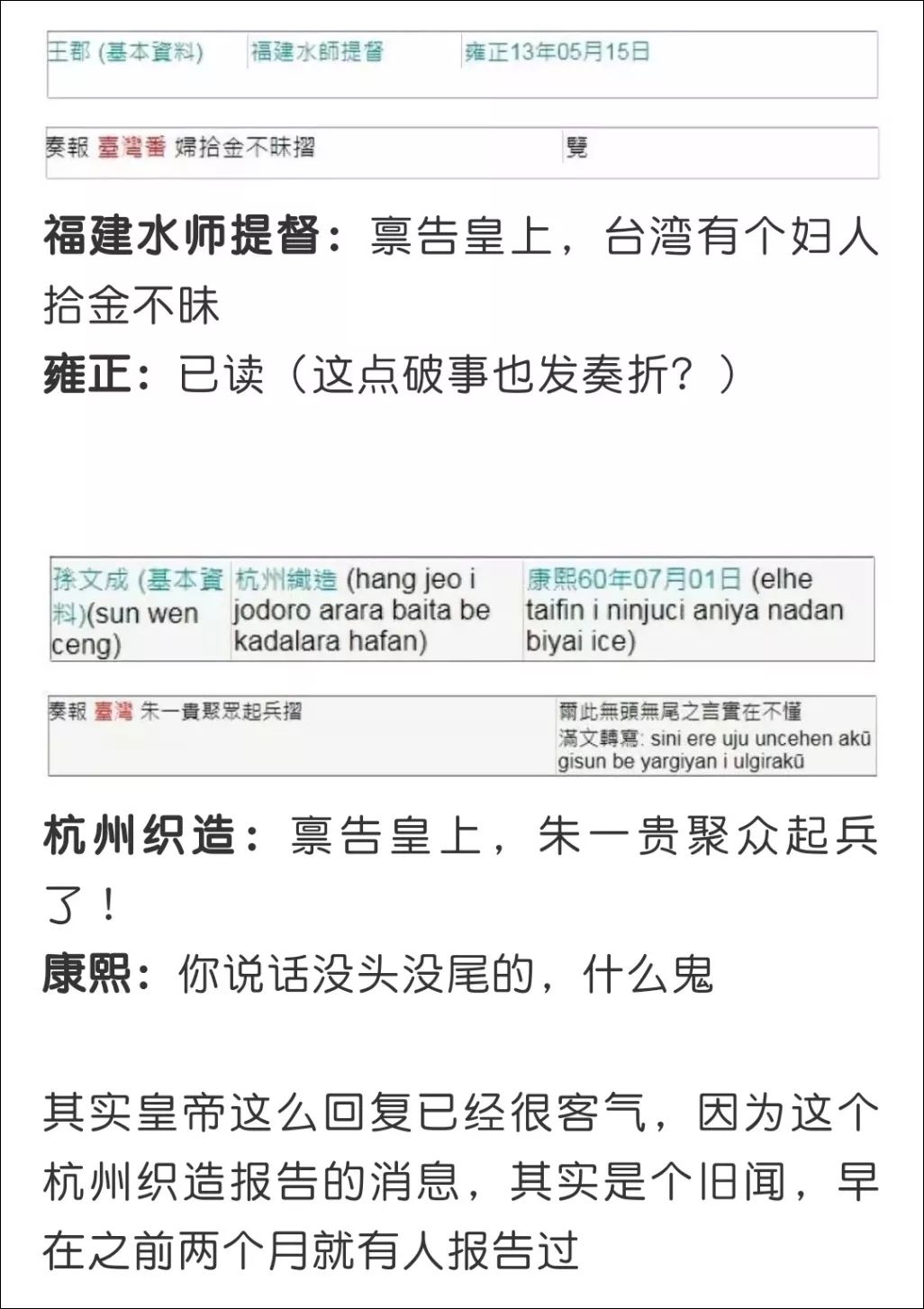 这几天,“网红皇帝”康熙和雍正又火起来了。台北故宫博物院官网公布了一批他们批阅的奏折,其中汇报内容之奇葩无趣,以及皇帝一本正经的批阅都让人忍俊不禁。