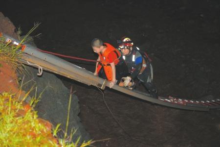 7月15日凌晨,西昌公安消防搭起梯子,将被困河中孤岛上的男孩营救上岸。