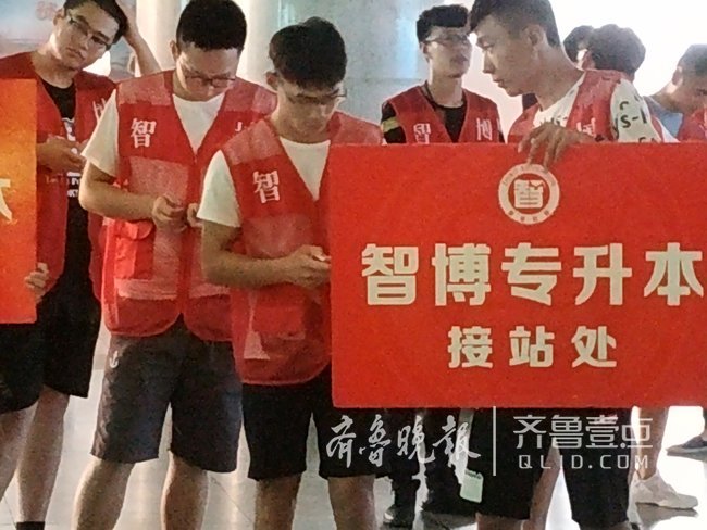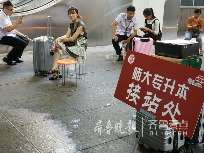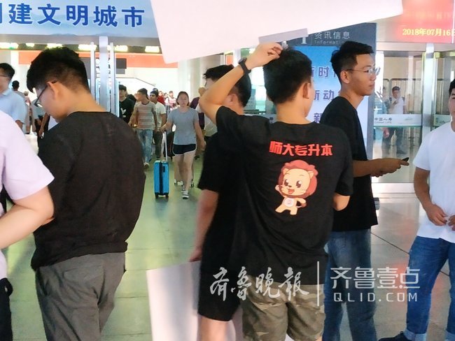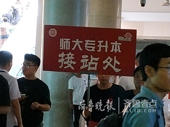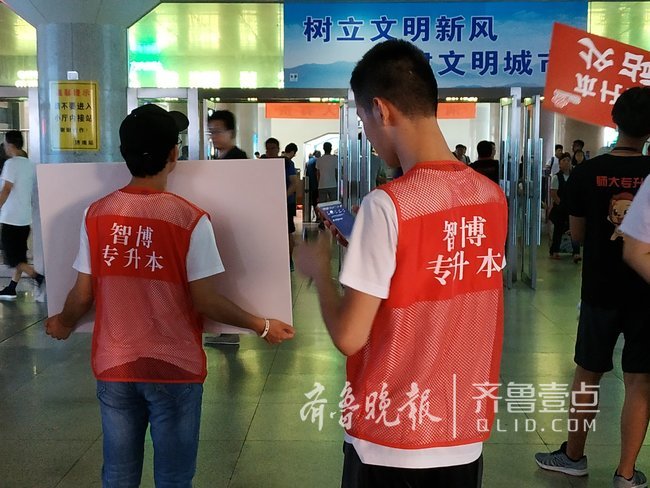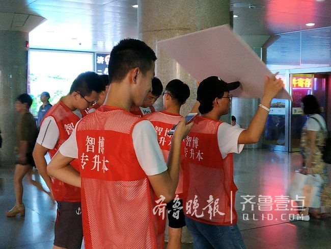 7月16日,齐鲁晚报•齐鲁壹点记者在济南火车站出站口看到,每当有列车到达,几十个举着“专升本接站处”牌子的年轻人就会拥到出站口“截人”,看上去竞争蛮激烈的。