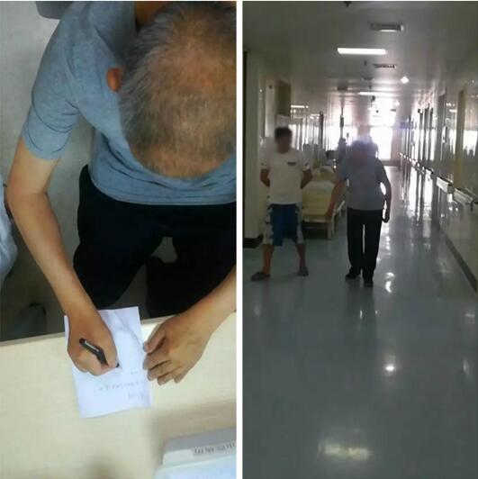 开机后的杨大爷终于可以拿笔写字了;他兴奋地拉着儿子走来走去