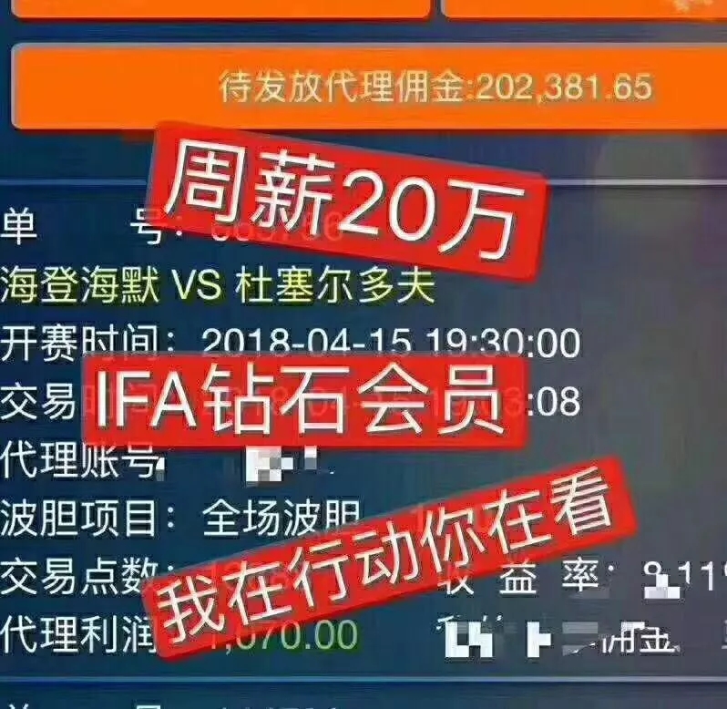 警方提供的资料显示,IFA平台代理分为八级,代理推广IFA可享受直推会员的20%的盈利作为佣金,晋升星级后,按等级可享受团队每场球赛盈利分成。一张IFA平台账户截图显示,一名钻石级代理佣金高达71万余元。截止警方收网前,IFA平台的全部会员数达334655名,各级代理共7376名,其中钻石代理57人,铂金代理65人,黄金代理108人。