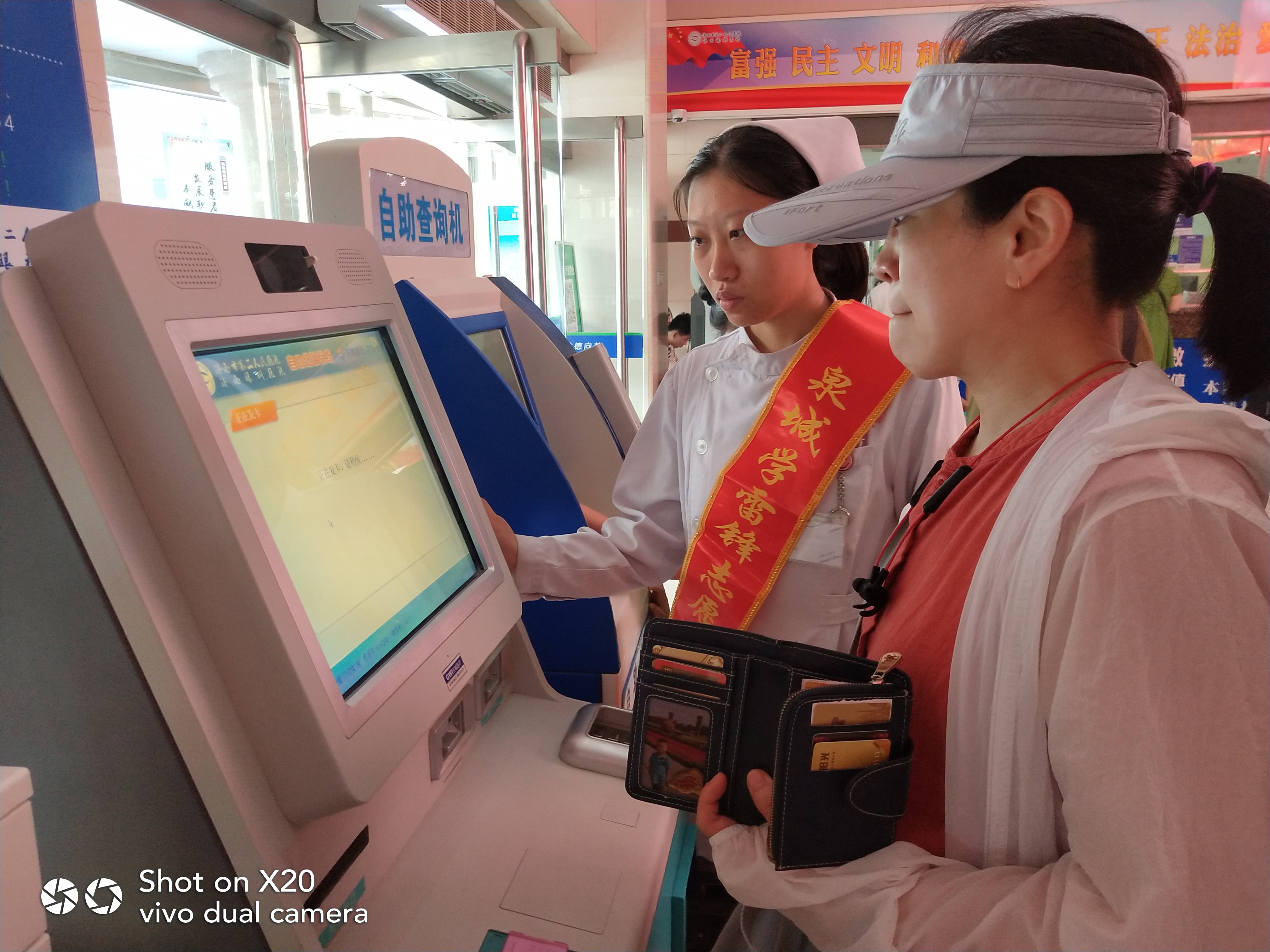 此外,医院“银医”系统也于7月19日正式启动,为了让患者享受到更加轻松便捷的就医感受,党员志愿者们在门诊大厅热情地指导、协助患者办卡、充值、查询等,耐心为患者解答疑惑。