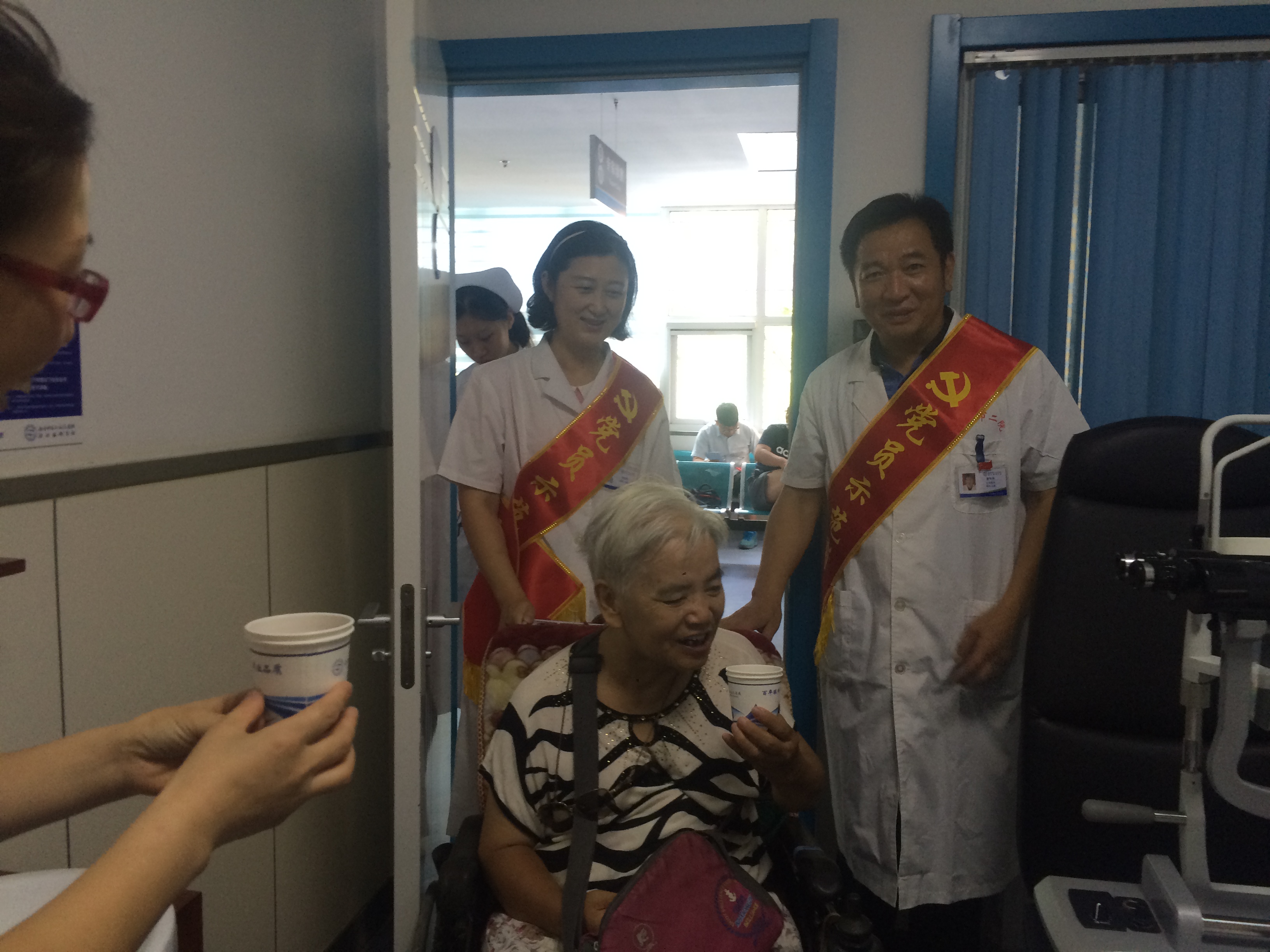 活动现场,党员志愿者们身着绶带,为患者们送上解暑的绿豆汤,并耐心协助患者就医。