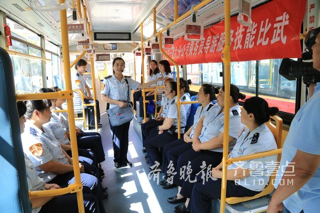19日,在公交市南巴士六分公司吉林路车队,来自104路、371路、110路的乘务员举行“乘务员技能比武”,现场设置“乘客找茬”、外语交流、“应急救护”等多个场景,评委现场打分,检验了乘务员的外语交流能力和应急处置能力,为了服务第二十届啤酒节,乘务员们练就了 “问不倒”、“一口清”、“活地图”等过硬本领。