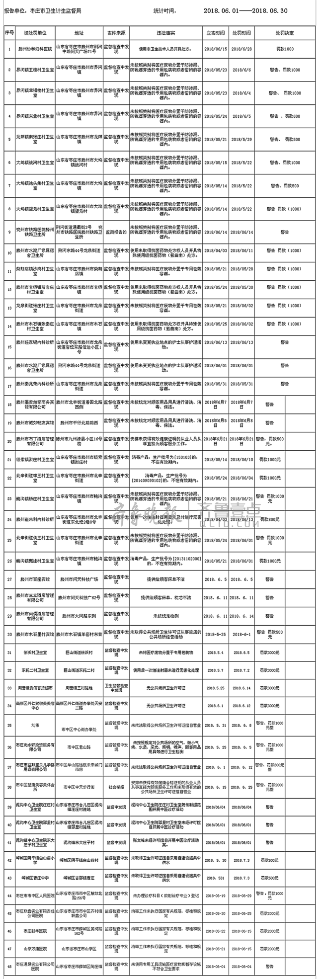 枣庄市卫生计生监督局近日公布了6月全市卫生计生行业处罚案件,涉及医院、乡镇卫生院、宾馆、学校、超市、美容机构等共计48例,分别受到警告、罚款等处罚。