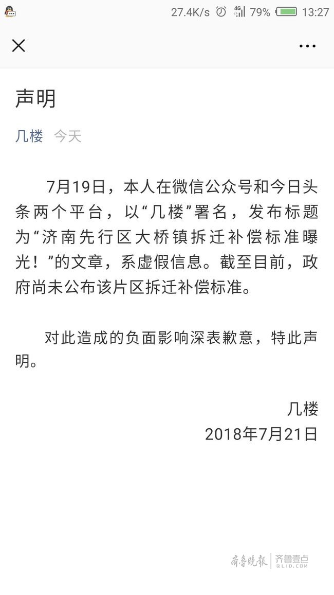 原标题:公众号散布济南先行区拆迁补偿谣言,男子被拘留五天 2018年7月20日中午,济南市公安局天桥