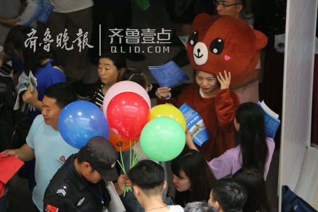 帅哥美女抢眼球、礼品抢生源,这些还不是最绝的。在高招会入口处,一所高职院校的一位女生,更是穿上了布朗熊的卡通服饰,蹦蹦跳跳的向学生和家长发放手中的宣传材料。她身边的几个同伴,一手拿着“社会人”小猪佩奇的气球,一手拿着学校的宣传材料。