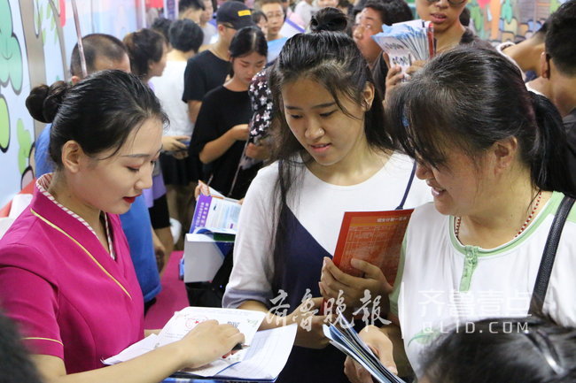 在山东理工职业学院展位前,乘务服务专业的漂亮学姐也成功吸引了不少学生和家长的眼球。站在学校的展架前,她向学生及其家长认真介绍学校的专业及招生情况,齐鲁晚报·齐鲁壹点家长看到她手中的登记表,已经留下了不少意向学生的信息。