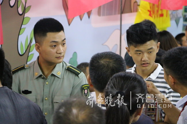 齐鲁晚报·齐鲁壹点记者在现场看到,东营科技职业学院展位前身穿绿色军训服装的帅哥很是抢眼。齐鲁晚报·齐鲁壹点记者了解到,他是学校石油化工专业的学生,也是2018级大一新生的军训导员,“这一上午有不少学生来找我咨询了。”